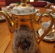 Moccaservice Motive wie aus dem Märchen,Barockstil, Mann und Frau, Kaffeekanne vergoldet, Zuckerdose rund und Sahnekännchen ebenfalls, 10 Tassen und Untertassen, dasselbe Motiv