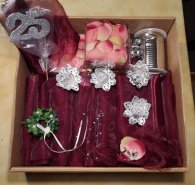 Eine silberne 25, dunkelrote Tüllstoffbahnen, 3 Kästen Deko-Rosenblätter, silbernes Geschenk...