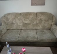 Verschenke mein 3-Sitzer Sofa mit Bettkasten in beigem Farbton mit schönem geometrischen Muster. Die Sitzfläche kann vorgezogen werden und kann dann als Schlafplatz genutzt werden.