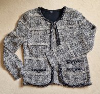 Schicker, gewirkter Damen Blazer/ Jacke der Firma BAZLER in Größe 40. Bequem zu tragen, Farbe schwarz mit Naturtönen und Lurexfaden, u.a. Bändchengarn. Zwei mit Knöpfen zu schließende Außentaschen, he...