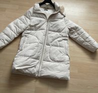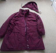 Ich biete eine warme Winterjacke mit abnehmbarer Kapuze. Sie ist 83 cm lang, von Achsel zu Achsel sind es 61 cm. Sie ist aus 100 % Polyester und kommt aus einem Nichtraucherhaushalt.