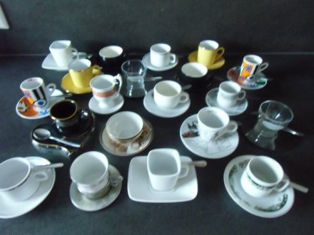 20 Espresso- / Mokkatassen bestehend aus Tassen, Untertassen und einigen Löffeln.